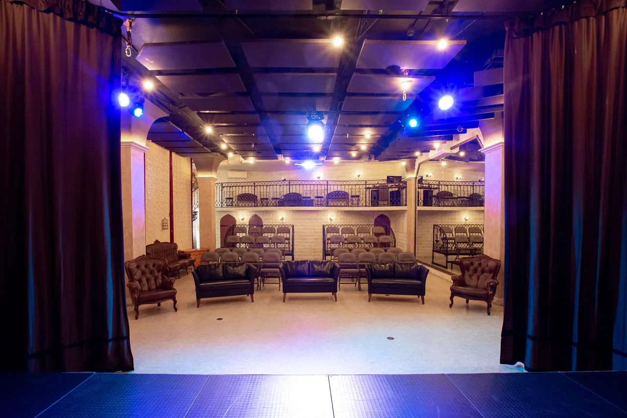 • зеркала высотой 4 м. и длиной 10 м.; • модульная сцена 49 кв. м.; • сценическая площадка 6×7 кв. м. оснащенная бархатным театральным занавесом высотой 4 м.; • 80 посадочных мест в форме амфитеатра; • мягкая кожаная мебель для создания VIP зоны.